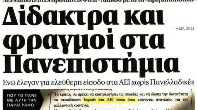 Χωρίς φραγμό η παραπληροφόρηση του Πρώτου Θέματος.Το νέο παραμύθι της εφημερίδας δεν έχει όμως ούτε πρίγκιπα, ούτε δράκο. Η περίφημη «πρόταση Φίλη-Λιάκου» που αναδεικνύει στο πρωτοσέλιδό του το Πρώτο Ψέμα, δεν είναι παρά μία φράση από τις προτάσεις κάποιου αγνώστου, οι οποίες περιλαμβάνονται στο πόρισμα του Εθνικού Διαλόγου για την Παιδεία, υπό τον τίτλο ΠΡΟΤΑΣΕΙΣ ΣΤΟΝ ΗΛΕΚΤΡΟΝΙΚΟ ΚΟΜΒΟ ΤΟΥ ΔΙΑΛΟΓΟΥ (η συγκεκριμένη βρίσκεται στη σελίδα 124 του σχετικού pdf).  Στο πρωτοσέλιδο της εφημερίδας, η φωτογραφία από το κείμενο και η υπογράμμιση της επίμαχης φράσης προϊδεάζουν για μια ακόμα «συγκλονιστική αποκάλυψη», από αυτές στις οποίες μας έχει συνηθίσει το συγκεκριμένο μέσο. Δυστυχώς, όμως, για το Πρώτο Θέμα, είναι πολύ εύκολο να εντοπίζει κάποιος ότι δεν είναι παρά.. κάτι που έγραψε κάποιος στο forum του υπουργείου Παιδείας.  Αν ένα δίδαγμα μπορεί να βγάλει κανείς από την παραδημοσιογραφία είναι ότι ένας πρίγκιπας ίσως αποτελεί τη βιτρίνα για έναν κατακίτρινο βάτραχο…