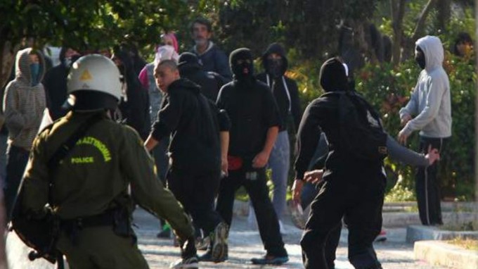 Νεαροί, τους οποίους η αστυνομία υπολογίζει σε περίπου 500 και που έχουν διασκορπιστεί στα γύρω στενά σε μικρές ομάδες, χρησιμοποιούν μολότοφ, πέτρες, ξύλα και φωτοβολίδες κατά των αστυνομικών, οι οποίοι απαντούν με εκτεταμένη χρήση χημικών.