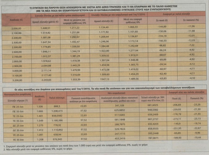 Η εφημερίδα αποκαλύπτει σήμερα τι συντάξεις δίνει το νέο ασφαλιστικό ανά Ταμείο και ανάλογα με το μισθό και τα έτη ασφάλισης για κάθε εργαζόμενο. Όπως φαίνεται στους πίνακες, η σύγκριση των νέων με τις παλιές συντάξεις βγάζει μειώσεις για όσους αποχωρήσουν από Δημόσιο, ΔΕΚΟ, τράπεζες και ΟΑΕΕ, με πάνω από 25 έτη, ενώ στο ΙΚΑ υπάρχουν και αυξήσεις για τους χαμηλόμισθους με 15 ως και 25 έτη ασφάλισης.