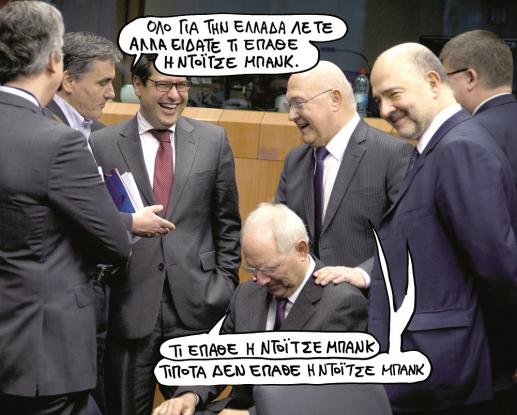 Ο νέος διευθυντής της Deutsche Bank Τζον Κράιαν έχει αποστολή να μειώσει τον επενδυτι­κό τομέα. Η τράπεζα, άλλωστε, έχει μετατραπεί σε επενδυτική, με ό,τι αυτό συνεπάγεται για τα ρίσκα σε μια παγκοσμιοποιημένη οικονομία και τις κατά καιρούς αναταράξεις της. Η Deutsche Bank κλονίζεται για πρώτη φορά σε τέτοιον βαθμό και ο πιο βασικός φόβος έχει να κάνει με την έκθεση της γερμανικής τράπεζας σε παράγωγα ύψους 55 τρισ. δολ.! Αν «σκάσει», αυτό το ποσό είναι ικανό να παρασύρει όλη την παγκό­σμια οικονομία. Να σημειωθεί ότι ακόμα και η ΕΚΤ έχει μοχλεύσει 29 φορές τα κεφάλαιά της!