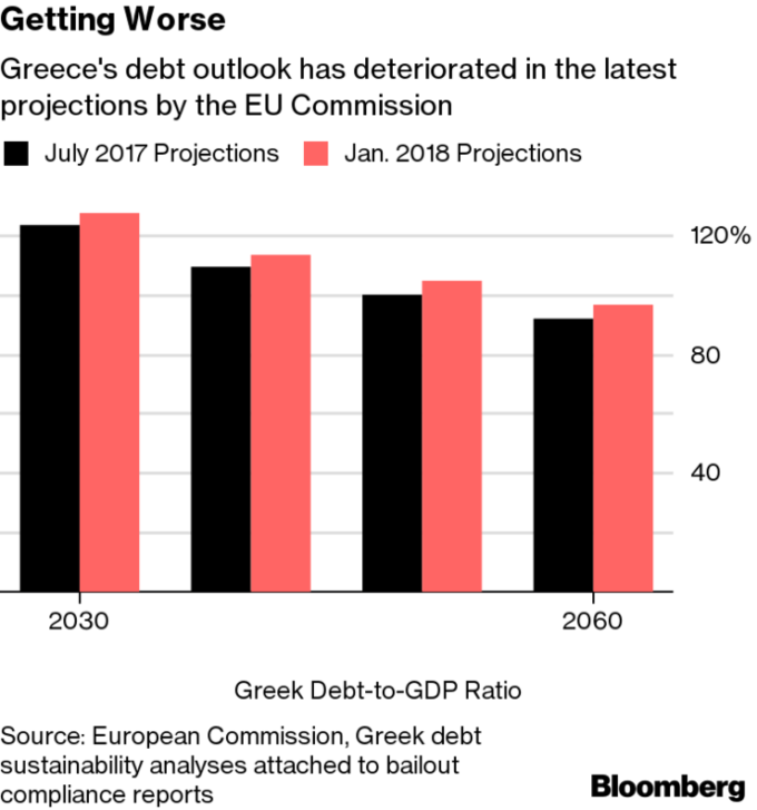 Όπως επισημαίνει, και σύμφωνα με το βασικό σενάριο της Κομισιόν, το χρέος της Ελλάδας θα διαμορφωθεί στο 181,1% το 2017, στο 165% το 2020, στο 127,2% το 2030 και στο 96,4% το 2060, προβλέψεις που είναι ελαφρώς πιο πάνω από ό,τι αναμενόταν στο τέλος της προηγούμενης αναθεώρησης τον Ιούνιο.