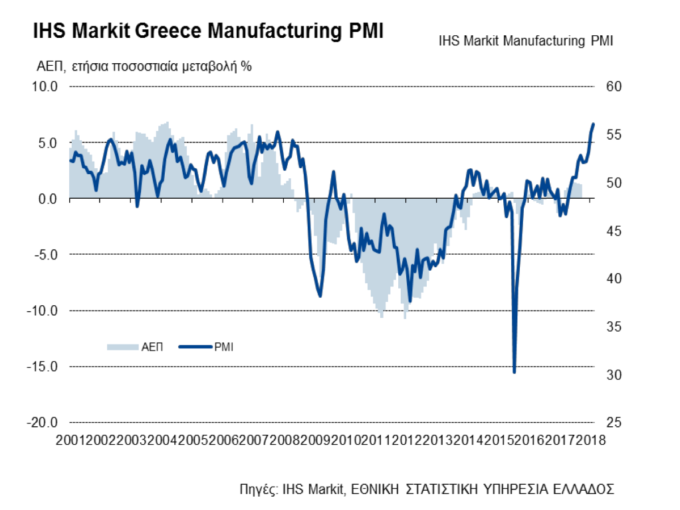 Ο εποχικά προσαρμοσμένος Δείκτης Υπευθύνων Προμηθειών της IHS Markit για τον τομέα μεταποίησης στην Ελλάδα (Purchasing Managers’ Index – PMI) -ένας σύνθετος δείκτης που έχει σχεδιαστεί για να μετρά την απόδοση της μεταποιητικής οικονομίας- έκλεισε πάνω από το σημείο μηδενικής μεταβολής των 50.0 μονάδων τον Φεβρουάριο. Επιπλέον, κλείνοντας στις 56.1 μονάδες, τιμή υψηλότερη από τις 55.2 μονάδες του Ιανουαρίου, ο δείκτης υπέδειξε την εντονότερη βελτίωση των επιχειρησιακών συνθηκών από τον Ιούνιο του 2000. Η αύξηση επέκτεινε την τρέχουσα περίοδο συνεχούς ανάπτυξης σε εννέα μήνες, τη μακρύτερη περίοδο συνεχούς αύξησης μετά την οικονομική κρίση.