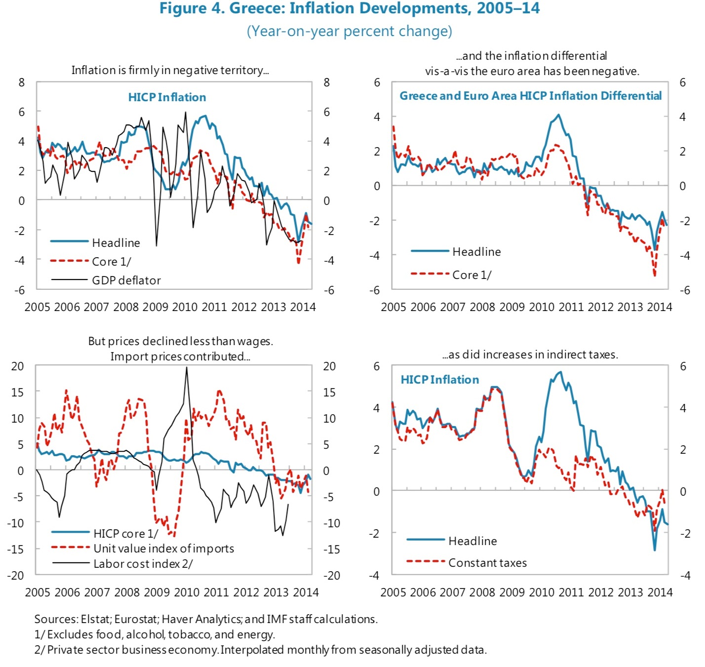 Ο πληθωρισμός βρισκόταν σταθερά σε αρνητική περιοχή (αποπληθωρισμός με ύφεση), αλλά οι τιμές των αγαθών μειώθηκαν λιγότερο σε σχέση με τους μισθούς λόγω των τιμών των εισαγόμενων προϊόντων όπως και λόγω των ΑΥΞΗΣΕΩΝ στους έμμεσους φόρους.
