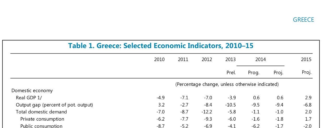 Παρακάτω βλέπουμε κάποια σημαντικά στοιχεία και οικονομικά κατορθώματα, αρκεί να δούμε την πρώτη σειρά όπου αναφέρεται το ΑΕΠ της χώρας μας με σταθερά αρνητικά πρόσημα και μία θα έλεγε κανείς και υπερβάλλουσα αισιοδοξία για το 2015 προφανώς για να βγουν τα νούμερα…..