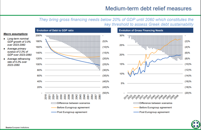 Αναφέρεται ότι το χρέος αναμένεται να μειωθεί στο 128% του ΑΕΠ το 2032, έναντι 134% του ΑΕΠ πριν τις παρεμβάσεις. Κρίνεται βιώσιμο χωρίς καμία άλλη παρέμβαση το 2032 αν διατηρηθεί το βασικό σενάριο της Κομισιόν στο οποίο βασίστηκαν οι παρεμβάσεις της 21ης Ιουνίου (σ.σ. δηλαδή μεταξύ άλλων και με πρωτογενή πλεονάσματα 2,2% του ΑΕΠ μεσοσταθμικά, τη στιγμή που ο ΥΠΟΙΚ εκ νέου χθες επαναλαμβάνει τη θέση του για μείωση των πλεονασμάτων στο μέλλον στο πλαίσιο της αλλαγής στάσης που ζητά να από την ΕΕ στο δημοσιονομικό πεδίο.