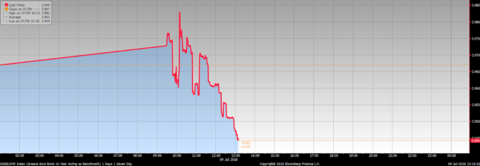 Χαμηλότερα από το 4% διατηρείται η απόδοση του ελληνικού 10ετούς. Το επιτόκιο διαμορφώνεται στο 3,94%. Την ίδια ώρα του 7ετούς κινείται σταθεροποιητικά στο 3,45% ενώ του 5ετούς στο 3,04%.