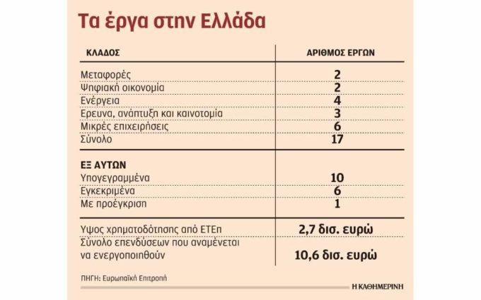 Σύμφωνα με τα στοιχεία της Κομισιόν μέχρι στιγμής έχουν συμβασιοποιηθεί δέκα επενδυτικά σχέδια που αφορούν την Ελλάδα, έχουν εγκριθεί άλλα έξι, ενώ έχει δοθεί προέγκριση για ένα ακόμη. Τα περισσότερα σχέδια αφορούν τη δανειοδότηση μικρότερων επιχειρήσεων, ενώ ιδιαιτέρως σημαντική είναι η ένταξη στο σχέδιο Γιούνκερ έργων, όπως τα έργα υποδομής στα 14 περιφερειακά αεροδρόμια με τη χρηματοδότηση από την ΕΤΕπ να φτάνει τα 280 εκατ. ευρώ. Επίσης, έχουν εγκριθεί ακόμη έξι έργα, ενώ προέγκριση έχει λάβει ένα ακόμη επενδυτικό σχέδιο.